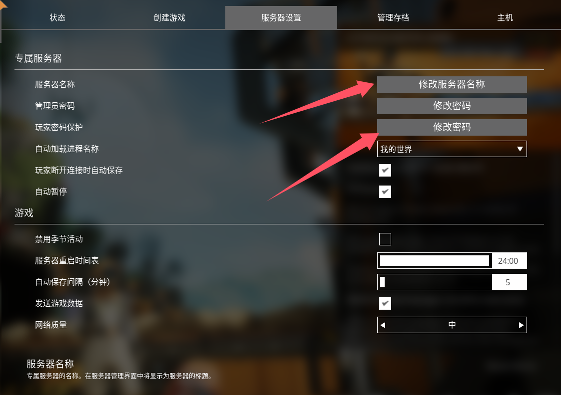 您可以在游戏中服务器管理的服务器设置中修改您的服务器名称、服务器密码以及各种设定